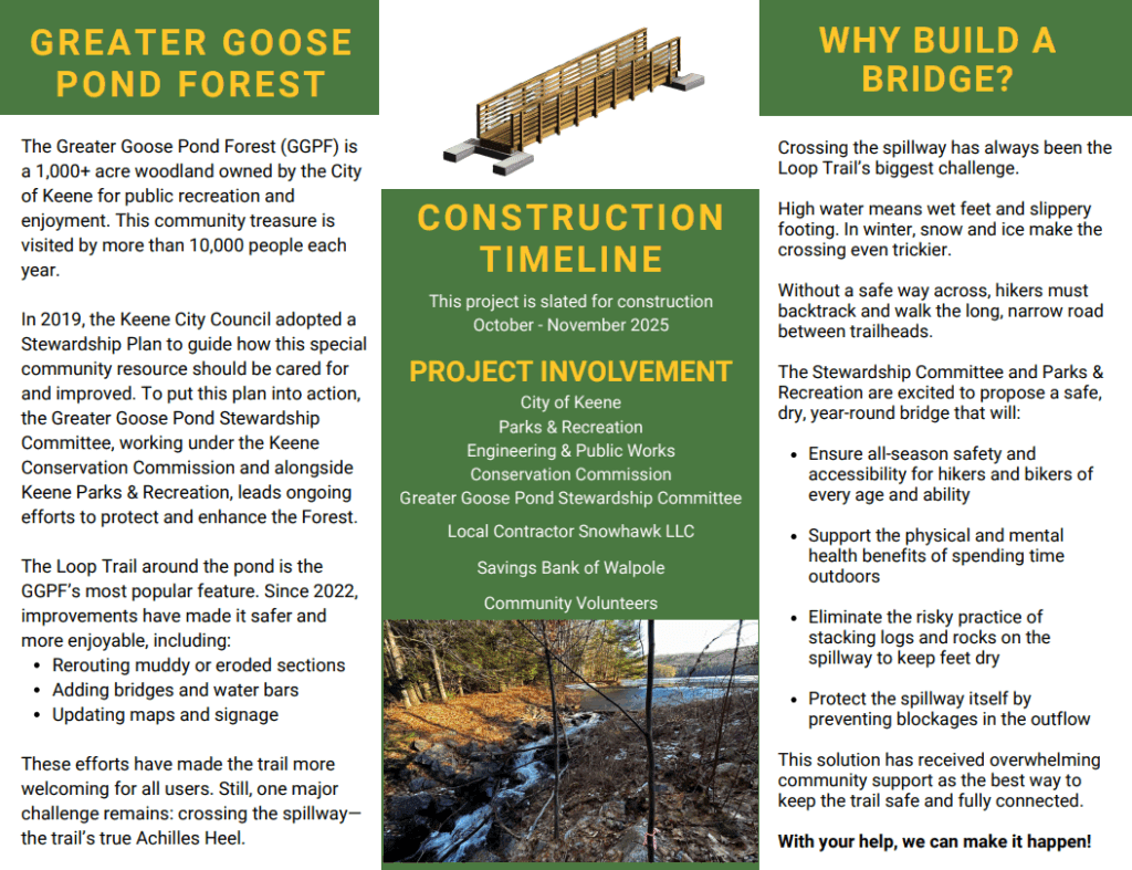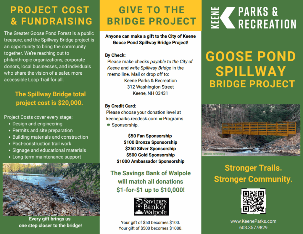 The Greater Goose Pond Forest is a community treasure. Join our stewardship community to make the popular Goose Pond Loop Trail more safe and accessible – with a new Spillway Bridge! Every donation will be matched – dollar for dollar up to $10,000 – through the generosity of the Savings Bank of Walpole.